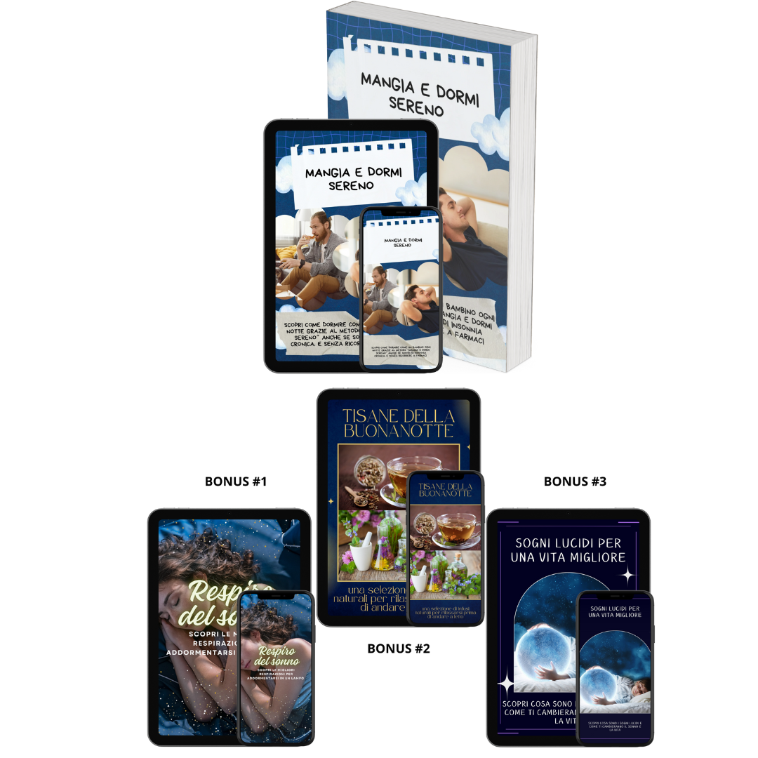 Con il nostro "Mangia e Dormi Sereno" , a soli 29 euro , hai a disposizione un metodo unico per migliorare il tuo sonno.